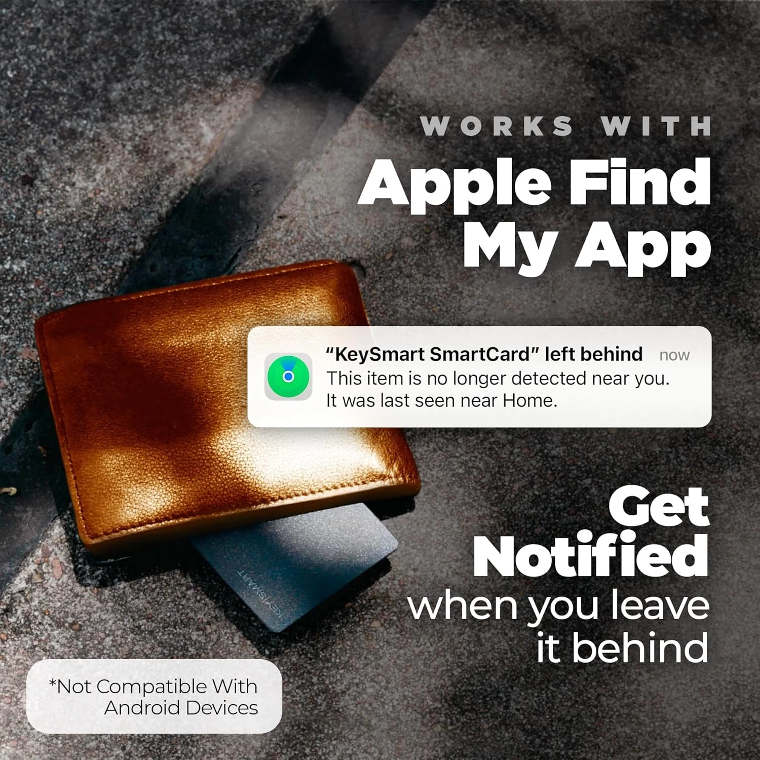 - Meldingen bij verlies helpen bij het terugwinnen. Apples "Waar is?" De app stuurt notificatie naar de mobiele telefoon als de KeySmart Card vergeten wordt. Privacy gegarandeerd door versleuteling.